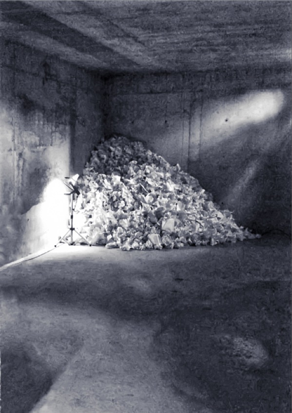 SEVENHOURS 2014 A square stack of DIN A4 paper is placed diagonally in front of a corner. The artist sits between the stack and the corner. He begins to crumple the individual sheets from above and throw them over his shoulder. If necessary, new rubber gloves are put on. The performance ends when the artist has disappeared into the pile. The individual sheets are brought from their specific storage form into an indefinite final form. The square becomes a two-dimensional triangle, three-dimensional tetrahedron. The artist disappears into it. Using a chest camera, the entire performance is subjectively recorded. All objective shots are asked by the audience on the part of the artist.